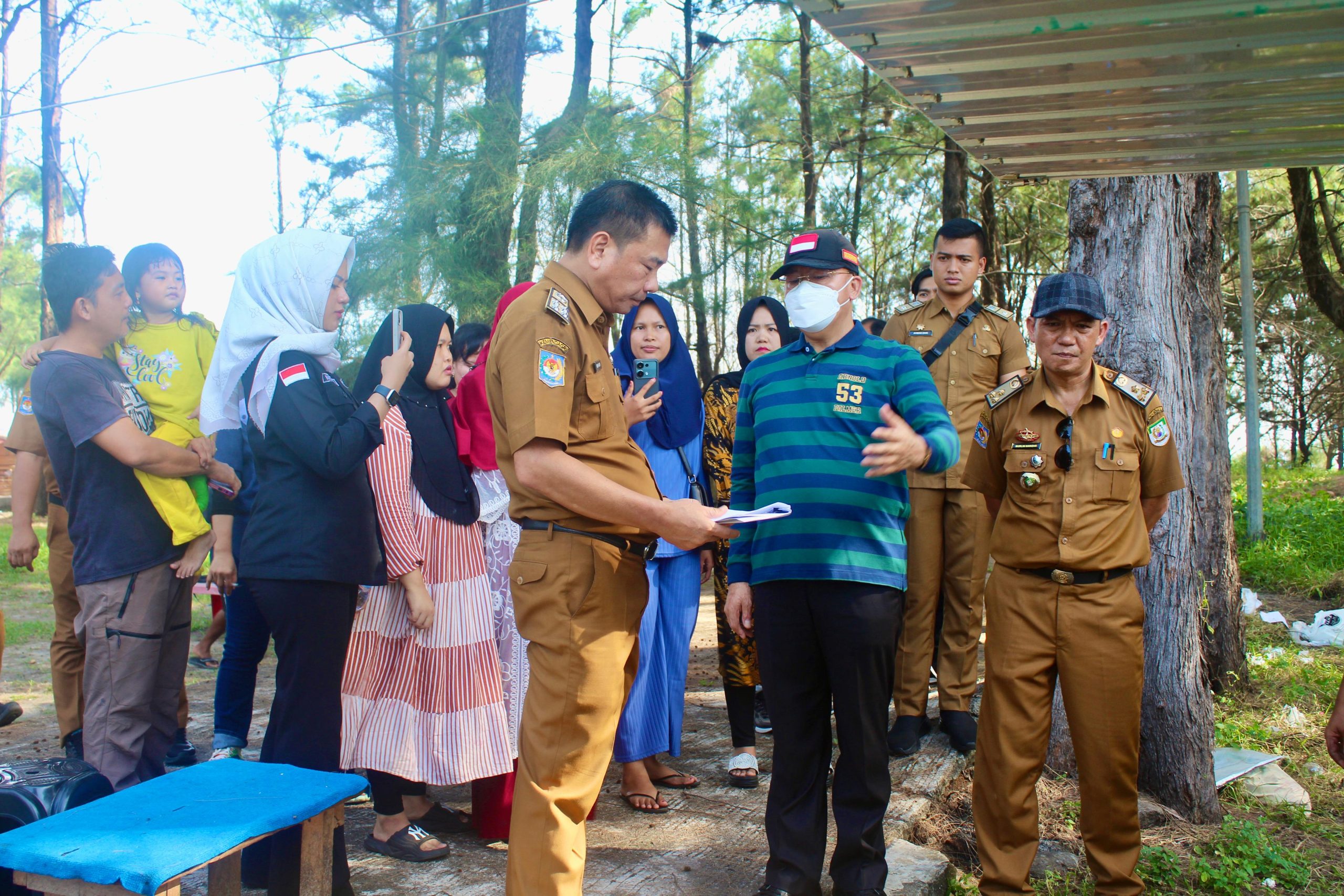 Gubernur Rohidin Mersyah bersama Kadis Pariwisata Provinsi Bengkulu Murlin Hanizar dan didampingi OPD terkait meninjau langsung titik pembangunan awning zona 1 di Pantai Panjang.