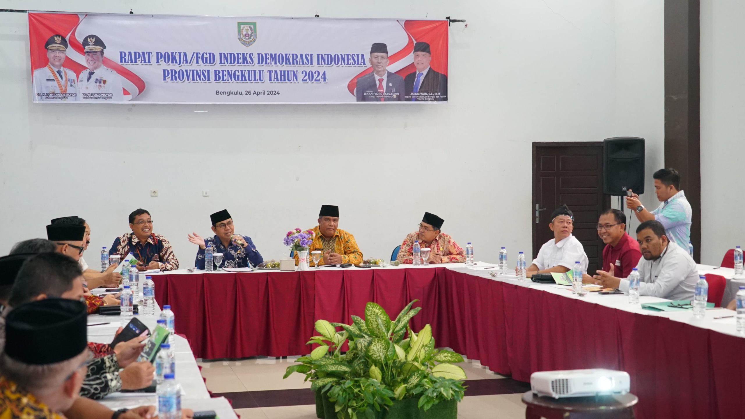 Asisten I bidang Pemerintahan dan Kesejahteraan Rakyat Setda Provinsi Bengkulu Khairil Anwar membuka Rapat Pokja/FGD Indeks Demokrasi Indonesia (IDI) Provinsi Bengkulu dengan tema “Mengefektifkan Tahapan Pengukuran IDI dan Mempercepat Rilis IDI Tahun Anggaran 2023” di Adeeva Hotel Pantai Panjang, Jumat (26/4/2024).