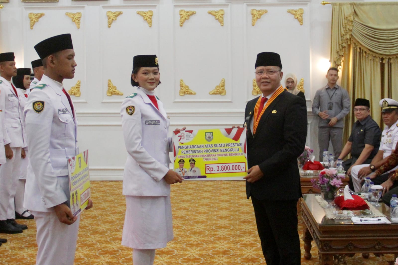 Gubernur Rohidin dalam kesempatan ini juga menyerahkan reward kepada Paskibraka Provinsi Bengkulu. Tanpa menunggu lama Gubernur menegaskan bahwa reward yang diterima oleh Paskibraka dapat segera dicairkan ke rekening masing-masing Paskibraka.