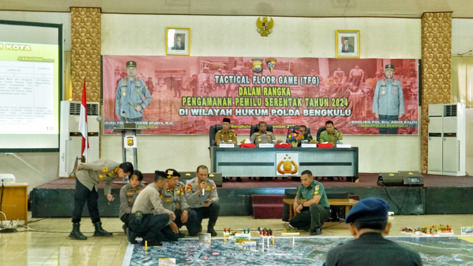 Berandang.com – Kepolisian Daerah Bengkulu menggelar kegiatan Simulasi Tactical Floor Game (TFG) ini merupakan rangkaian dari sistem pengamanan kota (Sispamkota) dalam rangka pengamanan pemilihan umum (Pemilu) serentak pada tahun 2024.