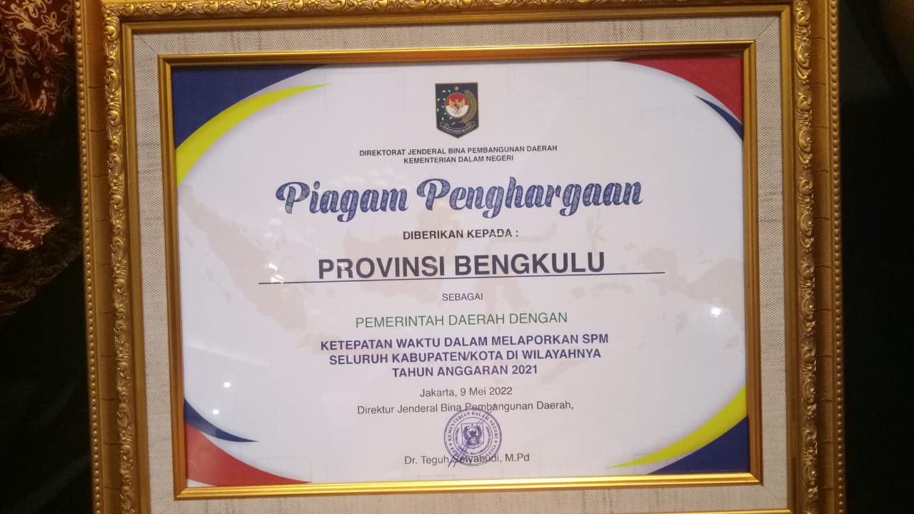 Pemprov Bengkulu berhasil meraih penghargaan sebagai Pemerintah Daerah (Pemda) dengan ketepatan waktu dalam melaporkan SPM seluruh kabupaten/kota pada Tahun Anggaran 2021.