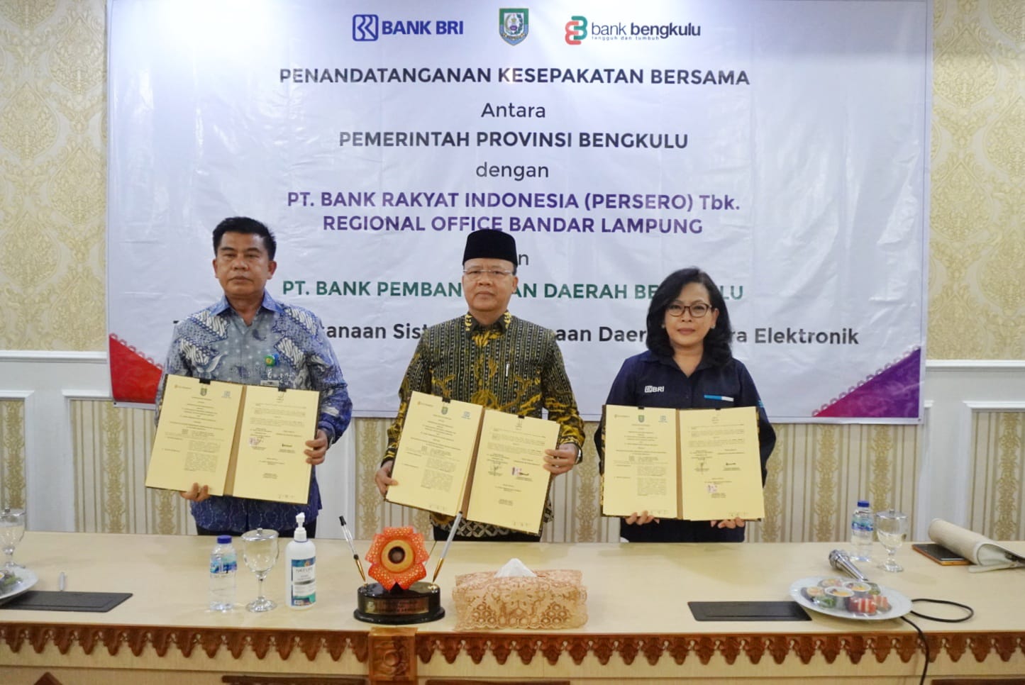 Berandang – Gubernur Bengkulu Rohidin Mersyah menandatangani kesepakatan bersama antara Pemerintah Provinsi Bengkulu dengan PT. Bank Rakyat Indonesia (Persero) Tbk. Regional Office Bandar Lampung dan PT. Bank Pembangunan Daerah Bengkulu tentang Pelaksanaan Sistem Penerimaan Daerah secara Elektronik di Provinsi Bengkulu.