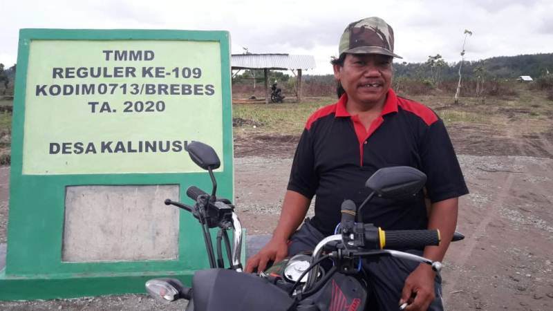 Tampak Edi (55), warga Desa Buaran, Kecamatan Bantarkawung, Kabupaten Brebes, berada di prasasti yang dibangun di titik 800 meter jalan hasil TMMD Reguler 109 Brebes sepanjang 2,2 kilometer itu. Jumat (23/10/2020).