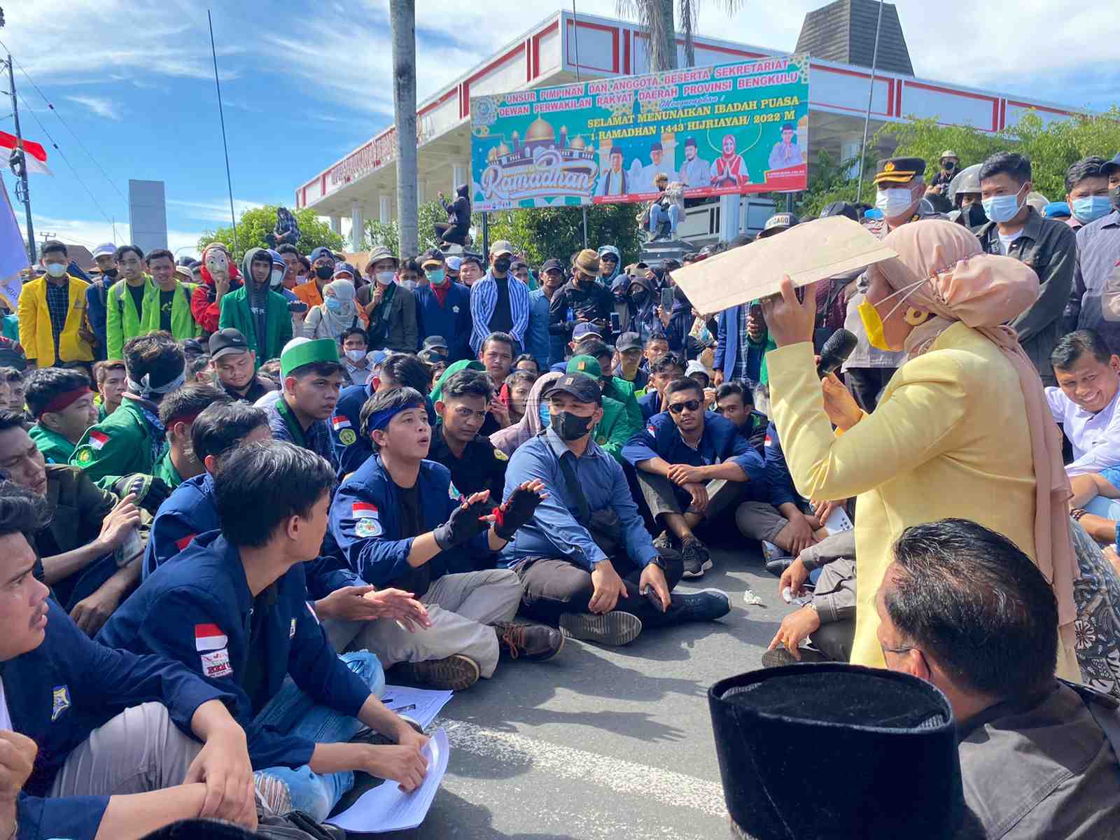 Berandang.com- Ribuan Mahasiswa dari berbagai Universitas di Bengkulu menyuarakan suaranya pada demo serentak di depan gedung DPRD Provinsi Bengkulu, Rabu (11/04/2022).