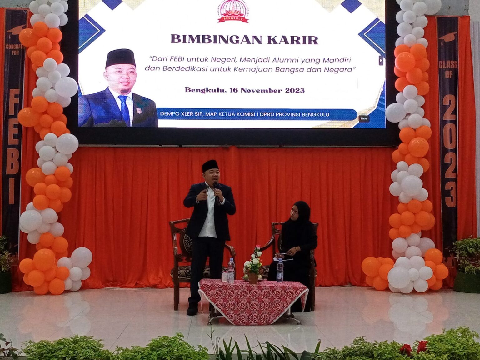 Berandang.com- Bengkulu, Pusaranupdate. com-Dempo Xler, SIP, MAP sebagai Ketua Komisi l DPRD Provinsi Bengkulu memberikan motivasi kepada lulusan Fakultas Ekonomi dan Bisnis Islam (FEBI) Universitas Islam Negeri Fatmawati Sukarno Bengkulu (UINFAS Bengkulu) di Gedung Serbaguna UINFAS Bengkulu, Kamis (16/11/2023).