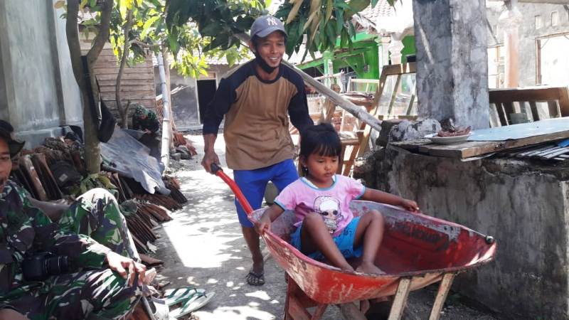 Damad juga merasa terbantu karena anaknya itu ikut diawasi dan diasuh, saat dirinya sibuk bekerja membantu TNI yang sedang mengerjakan rumah yang berukuran 6 x 9 meter miliknya itu, dimana progresnya sudah mencapai 87 persen atau tahap finishing.