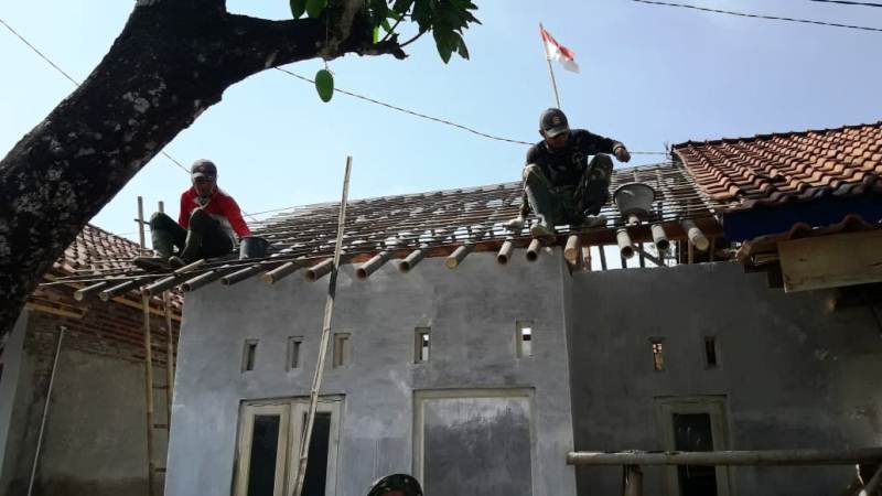 Brebes – Pemasangan reng mulai dilakukan di pekerjaan rehab Rumah Tidak Layak Huni (RTLH) program TMMD Reguler 109 Brebes senilai Rp. 10 juta, milik Karmin (38), warga Dusun Kutagaluh RT/RW. 02, Desa Kalinusu, Kecamatan Bumiayu, Kabupaten Brebes, Jawa Tengah.