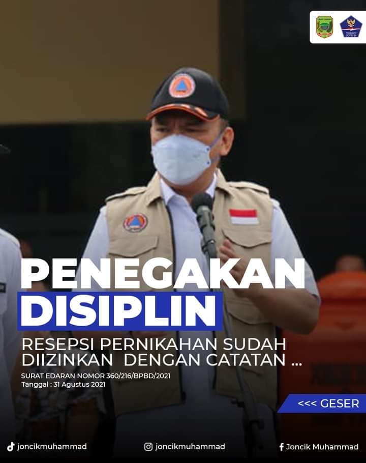 Meskipun demikian sambung Bupati, izin acara resepsi pernikahan ini dapat berlangsung dengan beberapa catatan yaitu berdasarkan aturan – aturan penyelenggara yang telah ditentukan dan apabila acara resepsi tersebut tidak berjalan sesuai dengan aturan penyelenggaraan maka akan dikenakan sanksi” Tegas Bupati Joncik Muhamad.