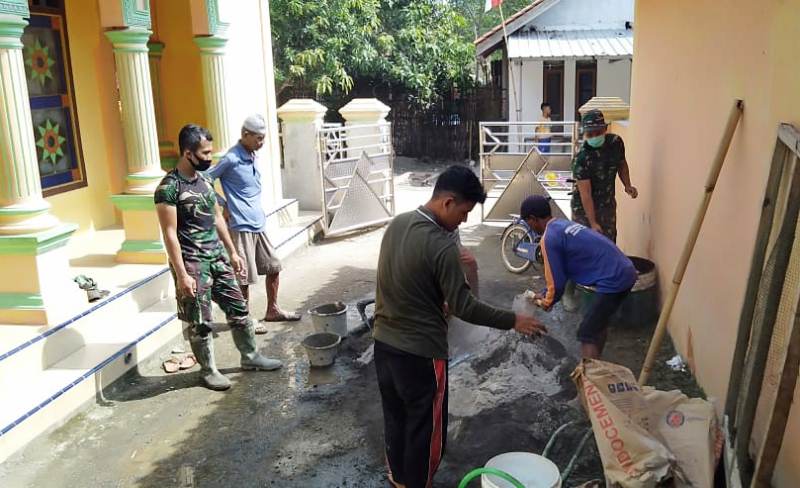 Brebes – Di ujung tugasnya di Desa Kalinusu, Kecamatan Bumiayu, kabupaten Brebes, Jawa Tengah, atau jari ke-26 pelaksanaan TMMD Reguler 109 Kodim 0713 Brebes, sejumlah anggota TNI menyempatkan waktu untuk membantu masyarakat Dukuh Karanganyar RT. 02 RW. 01, Kalinusu, yang sedang merenovasi sanitasi di Masjid Darussalam, Dukuh Karanganyar.
