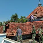 Pati – Anggota Satgas TNI Manunggal Membangun Desa (TMMD) Reguler 111 bersama warga masyarakat Desa Tamansari menurunkan genteng atau atap Masjid Baitul