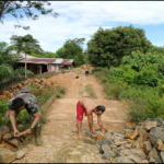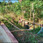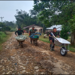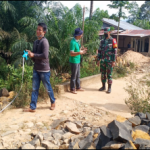 Bengkayang – Personel TNI yang tergabung dalam Satgas TMMD Bersama Masyarakat, Kembali Bergotong royong, meneruskan mengangkat Matrial Batu pembagunan jembatan Desa