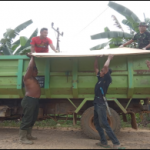 BENGKAYANG – Anggota Satgas TMMD ke-111 Kodim 1202/Singkawang bersama warga bahu-membahu menurunkan material dari dump truck di dusun Trymulia, desa Sentangau