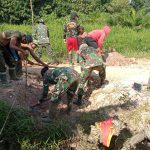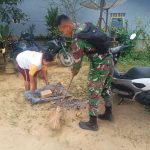 BENGKAYANG – Personil Satgas TMMD 111/ Kodim 1202 Singkawang, Praka Alfonsus Sihotang membantu warga Dusun Bukit Sangge Desa Sentangau Jaya, Kecamatan Seluas,