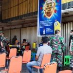 Kubu Raya – Satgas TMMD ke-111 Kodim 1207/Pontianak menghentikan para pejalan kaki dan pengendara sepeda motor yang tidak menggunakan masker disepanjang jalan
