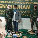 Kubu Raya – Pasca kegiatan TMMD ke-111 Kodim 1207/Pontianak, Babinsa membagikan masker kepada masyarakat Dusun Maju Jaya, Desa Kuala Mandor B, Kecamatan