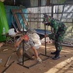 Pati – Disela-sela kesibukannya sebagai anggota Satgas TMMD Reguler ke-111 Kodim Pati, Serda Sukarji menyempatkan membantu bapak Sunaryo (52) warga Dukuh Pandahan