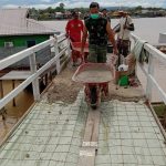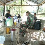 Jongkong – Terlihat Babinsa 1206-09/Jongkong mengadukkan Semen warga dalam perbaikan pengecoran jalan menuju Dermaga di Dusun Citra Melati Desa Jongkong Pasar kecamatan