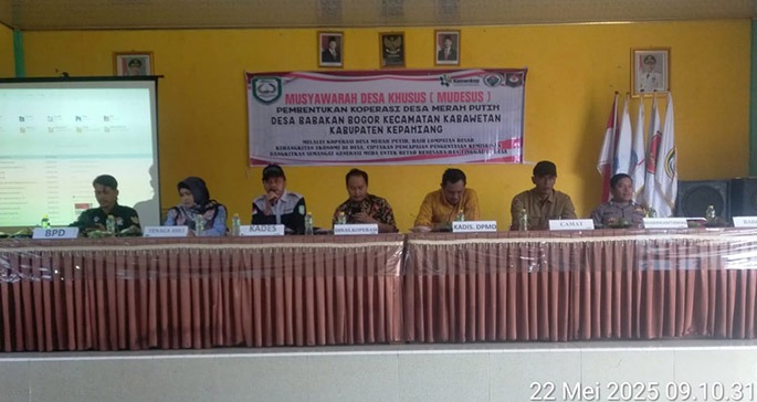 Berandang.com- Kepahiang. Pembentukan koperasi merah putih Desa Babakan Bogor Kecamatan Kabawetan Kabupaten Kepahiang melalui musyawarah desa khusus sah telah terbentuk dengan dihadiri pihak berkepentingan baik stakeholder Pemkab Kepahiang, Calon pengurus KDMP serta tim binaan Desa Kecamatan Kabawetan, Giat mudesus pembentukan koperasi desa merah putih digelar di aula Kantor Desa Babakan Bogor pada, Kamis (22/5/2025).