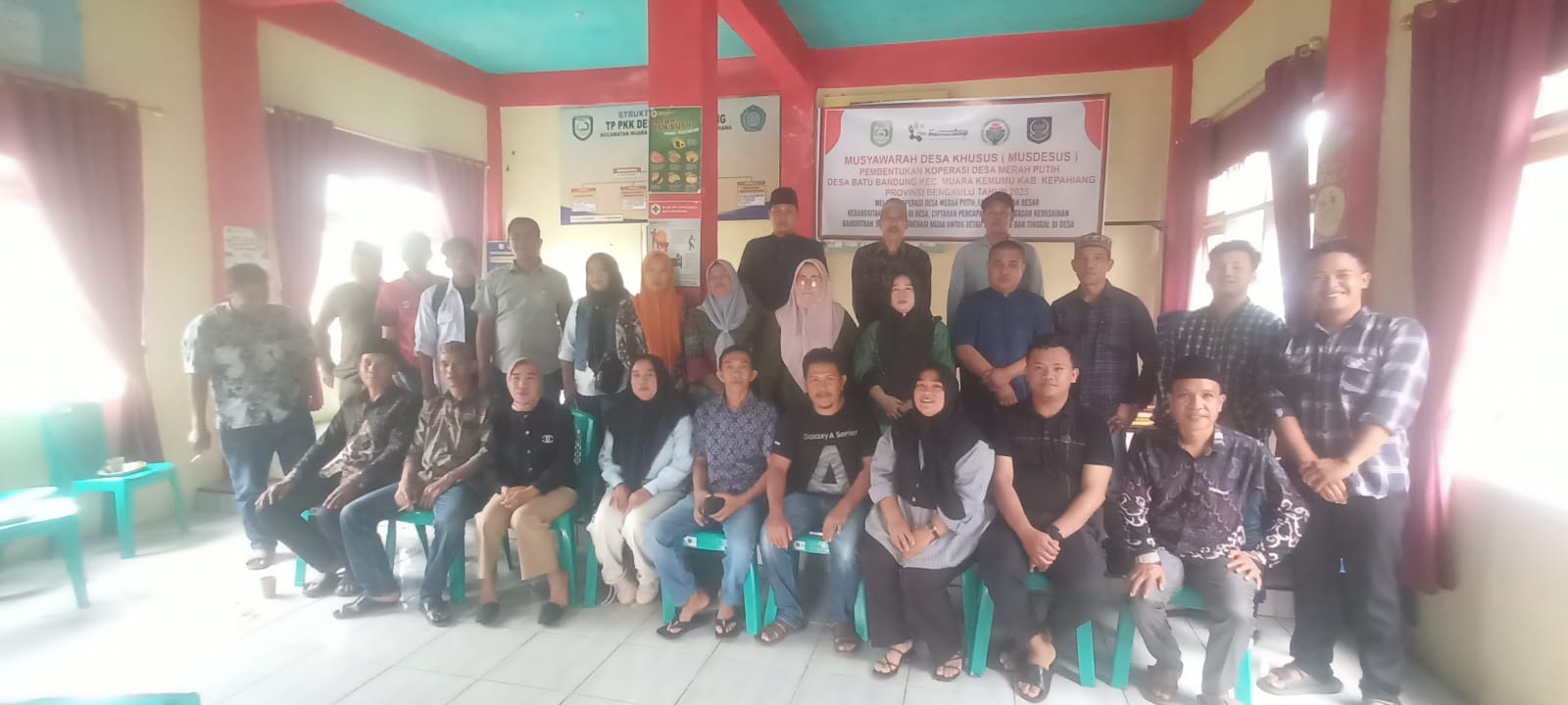 Kegiatan pembentukan pengurus Koperasi Merah Putih Desa Batu Bandung di hadiri Camat Muara Kemumu, Kepala Desa Batu Bandung beserta Perangkat Desa, Ketua dan anggota BPD, TA, Perwakilan Disdagkop UKM Kabupaten Kepahiang, Pendamping Desa, serta tokoh masyarakat Desa Batu Bandung.