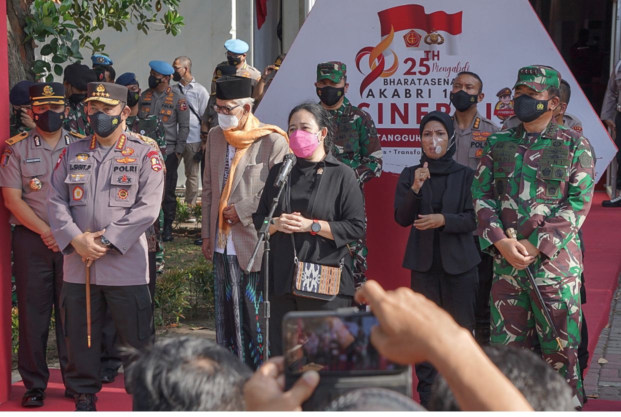 “Saya apresiasi yang dilakukan TNI dan Polri dalam proses vaksinasi dan pemberian bansos dan bagaimana mengedepankan transformasi digital UMKM,” kata Puan.