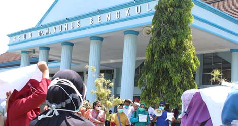 Peserta demo karyawan dan karyawati RSUD M Yunus menuntut pencairan dana remunarasi, uang lauk pauk (ULP), Jasa insentif covid-19 dan menuntut untuk transparansi dana BLUD RSUD M Yunus Bengkulu.
