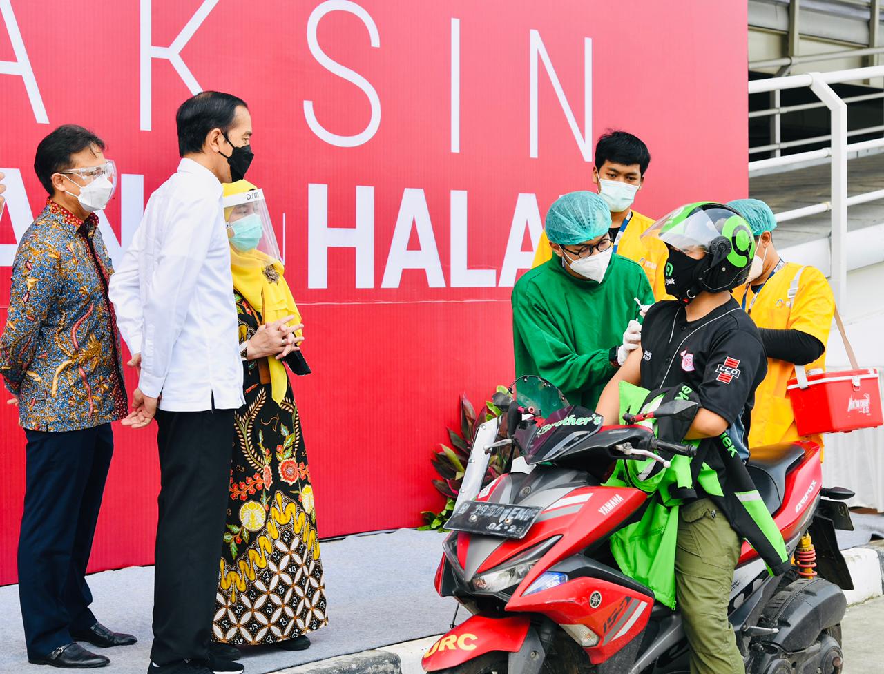 “Pagi hari ini saya meninjau pelaksanaan vaksinasi massal di Rumah Sakit Universitas Indonesia di Kota Depok yang dilakukan pada kurang lebih 1.500 para pendidik, lansia, dan juga pelayan publik. Tadi juga saya melihat langsung pelaksanaan vaksinasi drive thru untuk para pengemudi ojek, baik untuk roda dua, juga roda empat,” ujar Presiden usai peninjauan.