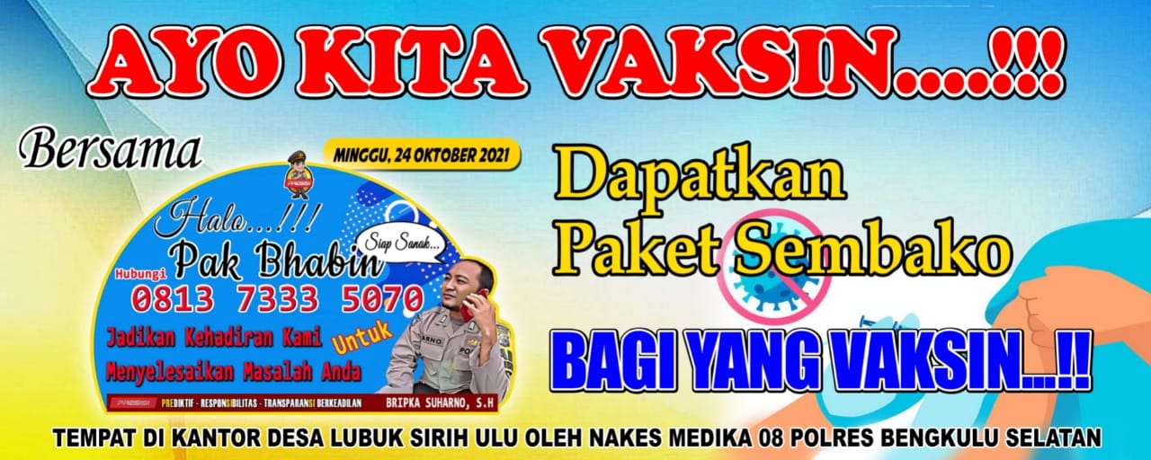 Berandang.com- Bhabinkamtibmas Polisi Sektor Manna Kabupaten Bengkulu Selatan, BRIPKA Suharno, SH sambangi rumah-rumah warga mengimbau masyarakat agar mengikuti program vaksinasi gratis. Kegiatan vaksinasi akan diselenggarakan di kantor desa Lubuk Sirih Ulu pada minggu (24/10/2021)