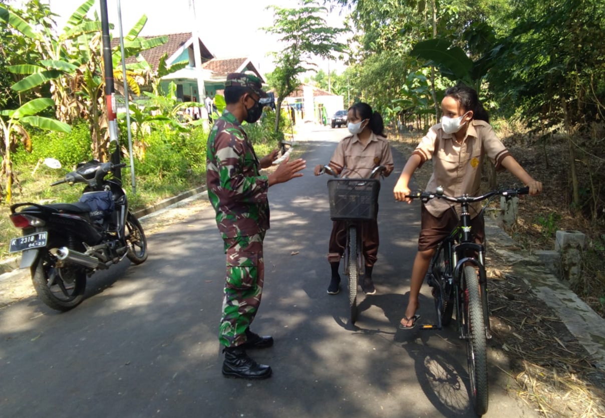 Seperti terlihat, Serda Irwanto salah satu anggota Satgas TMMD Reguler Kodim Pati sedang melakukan kegiatan himbauan kepada anak-anak warga Desa Tamansari yang melintas di jalan sepulang mengambil raport dari tempat mereka bersekolah.