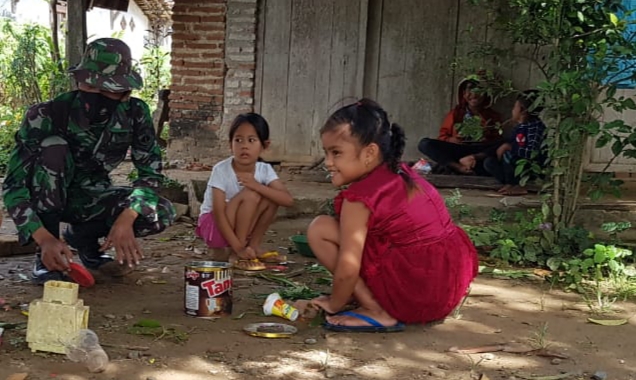 Pati – Tampak sekelompok anak-anak kecil seusia Sekolah Dasar yang sedang bermain pasaran di depan rumah warga, disambangi Serda Sukarji anggota Satgas TMMD Reguler ke-111 Kodim 0718/Pati, pasalnya dirinya penasaran anak-anak Desa Tamansari masih mengenal permainan ini. Senin (28/6/2021).