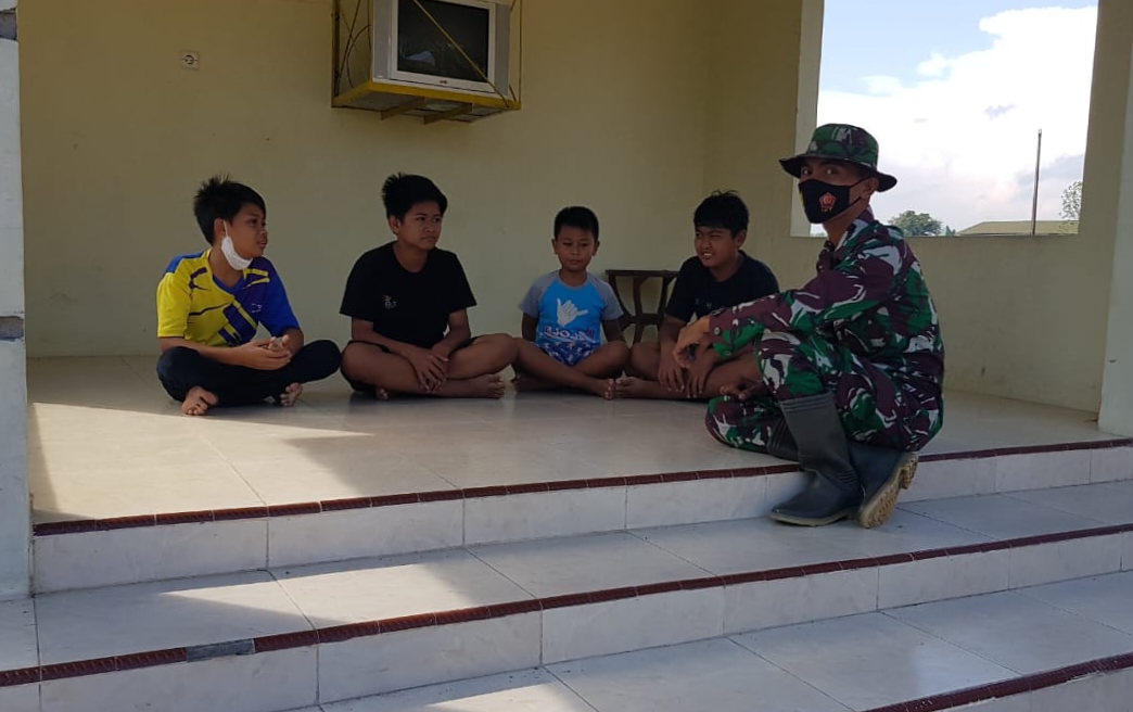 Seperti terlihat kali ini, Serda Sukarji anggota Satgas TMMD Kodim Pati melaksanakan kegiatan komsos bersama anak-anak di Dukuh Kalimati, Desa Tamansari, Senin (12/7/2021).