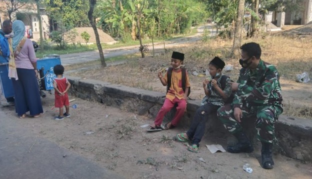 Mereka menonton aktivitas yang dilaksanakan anggota Satgas Pra TMMD ke-111 Kodim 0718/Pati. Serda Hurito setiap harinya melaksanakan pekerjaan Pra TMMD di wilayah itu dan menyempatkan diri bercanda dan bermain anak-anak yang sedang menonton pengerjaan pembukaan jalan di lokasi TMMD, Selasa (08/06/2021).