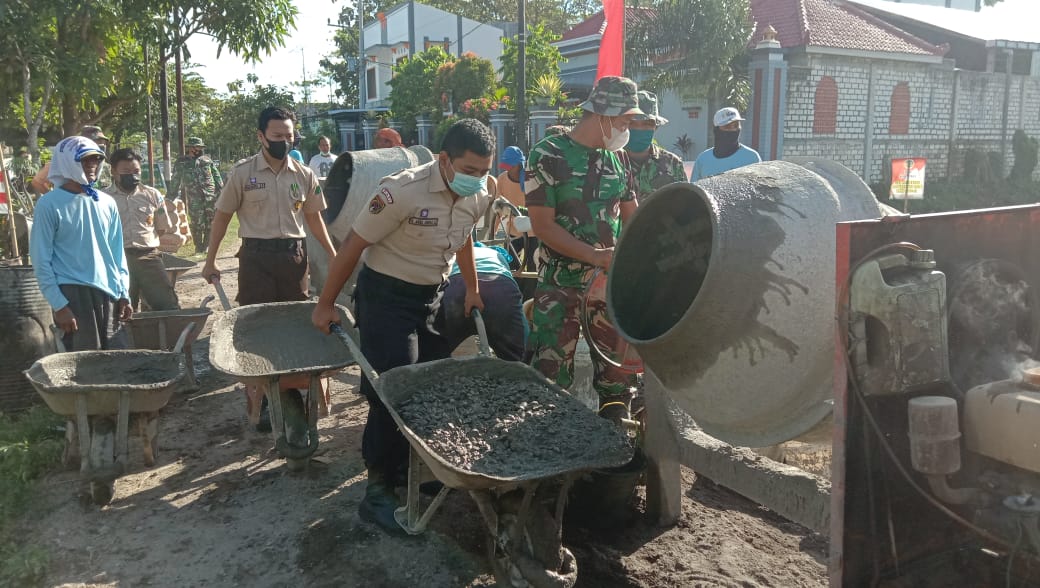 Pati – Anggota Pramuka Saka Wira Kartika binaan Kodim 0718/Pati juga ikut berpartisipasi di sasaran fisik rabat beton jalan dalam program TMMD Reguler Ke-111 TA.2021 Kodim 0718/Pati, di Desa Tamansari, Kecamatan Jaken, Kabupaten Pati. Rabu (7/7/2021)