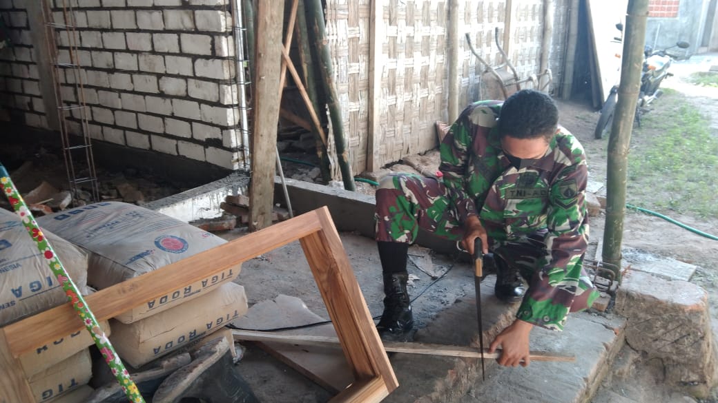 Sejumlah Satgas Pra TMMD dan Warga Desa Tamansari mulai mengerjakan pembangunan pada tahap awal, pada pagi tadi Namun beberapa unit Rumah Tidak Layak Huni (RTLH) belum usai. Serda Ahmad Sujarwo tampak memotong papan dengan sebuah alat bantu pertukangan, gergaji.