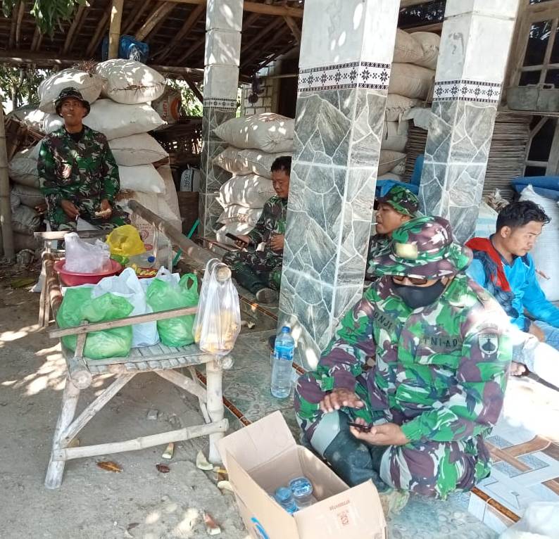 Pati – Usai melakukan pengecoran jalan persawahan dalam rangka TMMD Reguler Ke-111 di Desa Tamansari, anggota Satgas TMMD bersama warga istirahat sejenak di teras depan rumah di samping gudang dekat di lokasi TMMD tersebut.