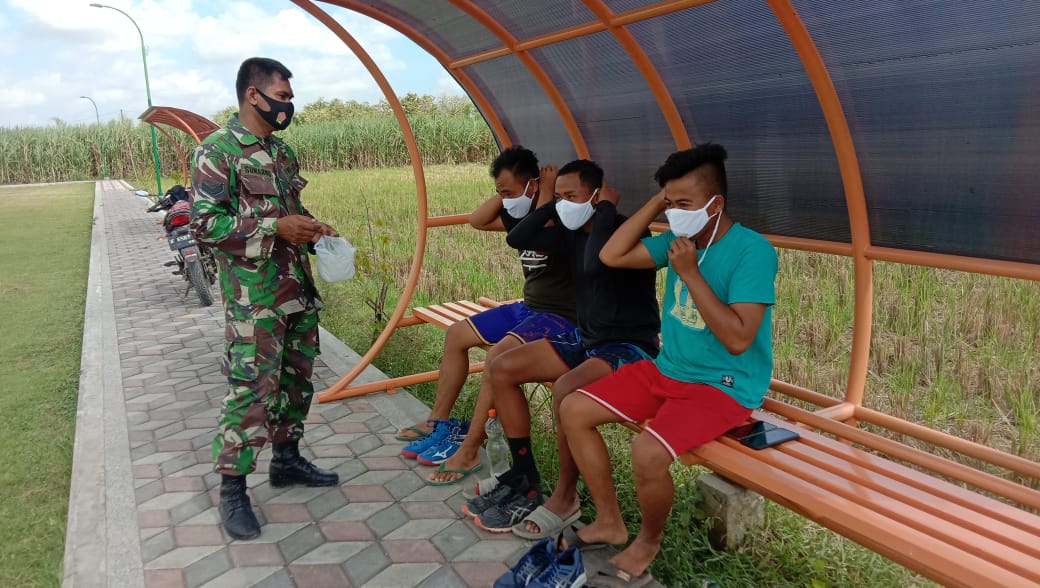 Dimana saat ini di Jawa Tengah yang sedang terjadi lonjakan angka kasus penularan Covid19 ini, Sertu Sumarno anggota satgas TMMD Kodim 0718/Pati, disela-sela istirahat melaksanakan Komunikasi Sosial dengan cara memberikan masker secara gratis dan mengedukasi kepada pemuda desa salah satunya bernama Afif Syah (21), yang selesai melaksanakan jogging di lapangan bola Desa Tamansari, kegiatan yang dilakukan ini untuk menekan penularan atau penyebaran virus Covid19 tersebut.