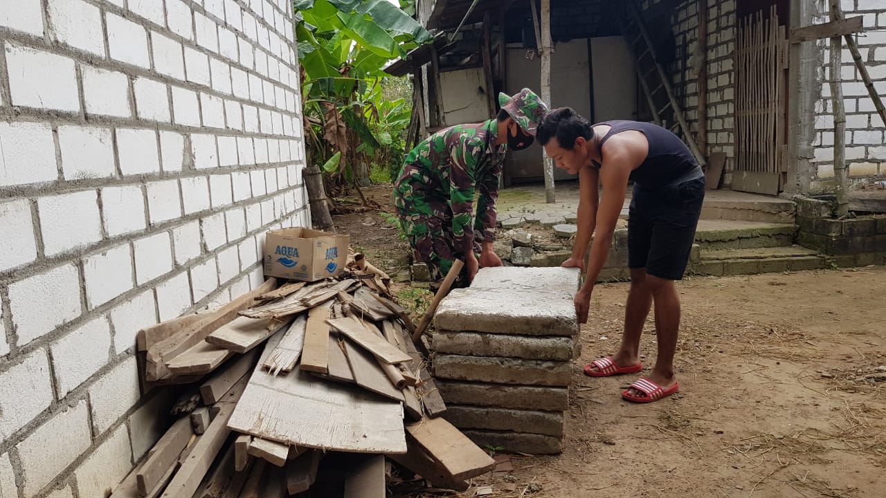 Tanto (35) warga Dukuh Kemiri, Desa Tamansari, yang kebetulan rumahnya bersebelahan dengan penerima bantuan RTLH saat itu sedang membenahi saluran air dirumahnya. Serda Supriyadi mengatakan jika Tanto sudah mencetak tutup saluran air dengan cor beton yang di buat lempengan, sehingga hanya tinggal mengangkat dan memasang diatas saluran air. Sabtu (26/06/2021)