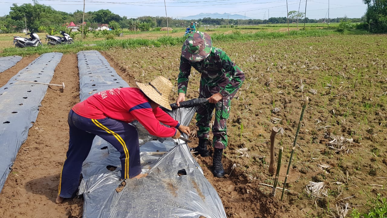 Tampak terlihat anggota satgas TMMD reguler 111 Kodim Pati Serda Bari Ervianto bersama Dadik (51) warga Dukuh Kalimati sedang sibuk menutup rapat bedeng dengan mulsa plastik. Dijelaskan oleh Dadik jika mulsa plastik berguna untuk mencegah pencucian pupuk oleh air, menjaga kelembapan tanah, menghindarkan tanaman dari percikan tanah, serta menekan pertumbuhan gulma. Selasa (29/06/2021).