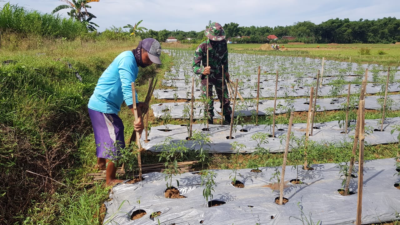 Pati – Banyak hal yang dilakukan satgas TMMD disela kegiatan istirahatnya dalam bekerja, mereka memanfaatkan waktu untuk komsos menjalin keakraban dengan masyarakat Desa Tamansari, seperti yang dilakukan Serda Supriyadi yang membantu warga memperkuat tanaman cabai kriting dengan cara diberi sandaran bambu kecil, pada bagian sisi batang cabai, Selasa (29/06/2021).
