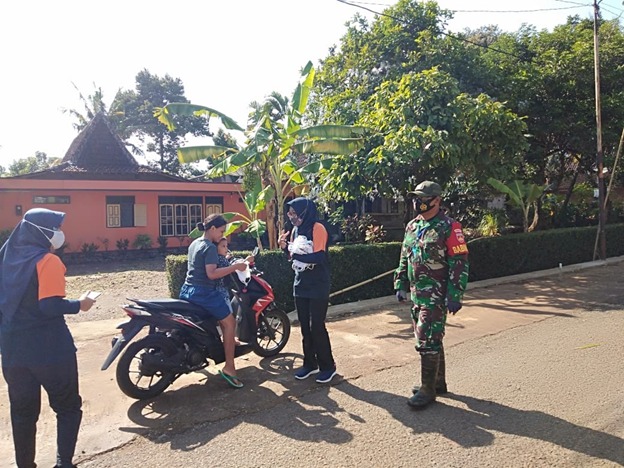 Tampak Koptu sambaz salah seorang anggota Satgas TMMD Ke-111 Kodim 0718/Pati bersama perangkat Desa Tamansari, sedang membagikan masker kepada warga Desa yang kebetulan tidak menggunakan masker saat mengendarai motor.