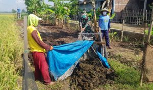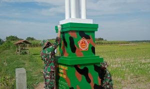 Pati – TNI Manunggal Membangun Desa (TMMD) Reguler Ke-111 TA.2021 Kodim 0718/Pati. Anggota Satgas TMMD bersama warga Desa yang masih melanjutkan pencapaian 75 % pengerjaan pembuatan Tugu Prasasti TMMD Reguler Ke-111 di Desa Tamansari, Kecamatan Jaken, Kabupaten Pati.