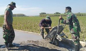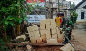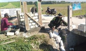 Pati – TNI Manunggal Membangun Desa (TMMD) Reguler Ke-111 TA.2021 Kodim 0718/Pati. Anggota Satgas TMMD bersama warga Desa yang masih melanjutkan pencapaian 75 % pengerjaan pembuatan Tugu Prasasti TMMD Reguler Ke-111 di Desa Tamansari, Kecamatan Jaken, Kabupaten Pati.