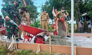 Pati – TNI Manunggal Membangun Desa (TMMD) Reguler Ke-111 TA.2021 Kodim 0718/Pati. Anggota Satgas TMMD bersama warga Desa yang masih melanjutkan pencapaian 75 % pengerjaan pembuatan Tugu Prasasti TMMD Reguler Ke-111 di Desa Tamansari, Kecamatan Jaken, Kabupaten Pati.
