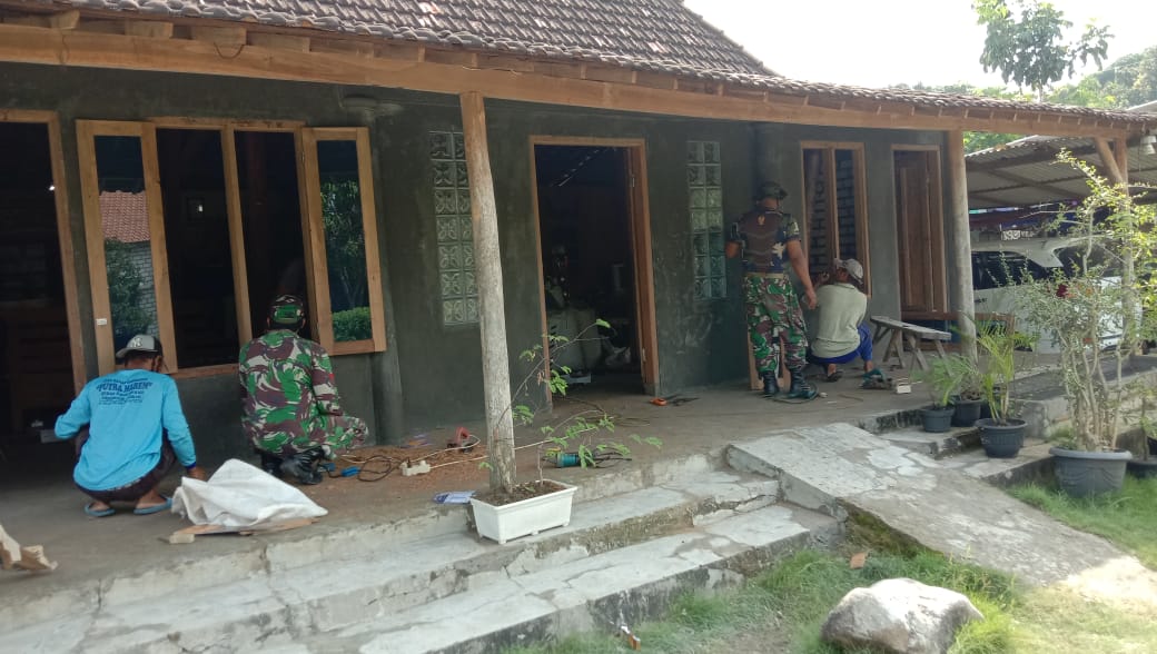 Pati – Proses pembangunan Rumah Tidak Layak Huni (RTLH) yang sudah berjalan dikerjakan Satgas TNI Manunggal Membangun Desa (Satgas TMMD) Reguler Ke-111 Kodim 0718/Pati, setelah selesai mengerjakan pembongkaran, pemasangan bata putih, plesteran dan acian, kini rumah milik Yarman (57) sedang dikerjakan pemasangan daun pintu dan jendela, Minggu (4/7/2021).