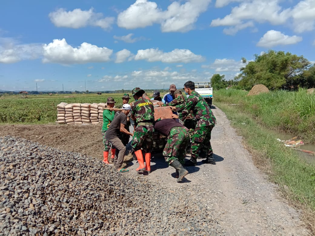 Terlihat dilokasi anggota TNI dibantu warga desa sedang menarik dan mendorong mesin molen untuk kemudian ditempatkan mendekat dengan lokasi pengerjaan betonisasi jalan, ini dimaksudkan agar mendapatkan posisi yang tepat, dekat material dan lokasi pekerjaan.