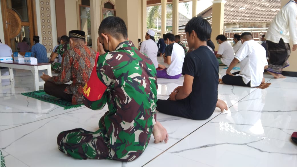 Pati – Untuk memelihara dan meningkatkan keimanan dan ketaqwaan, anggota Satgas TNI Manunggal Membangun Desa (TMMD) Reguler Ke-111 TA. 2021 Kodim 0718/Pati yang sedang melaksanakan penugasan di Desa Tamansari, Kecamatan Jaken, Kabupaten Pati, menunaikan Sholat Jum’at bersama warga setempat. Jumat (2/7/2021)