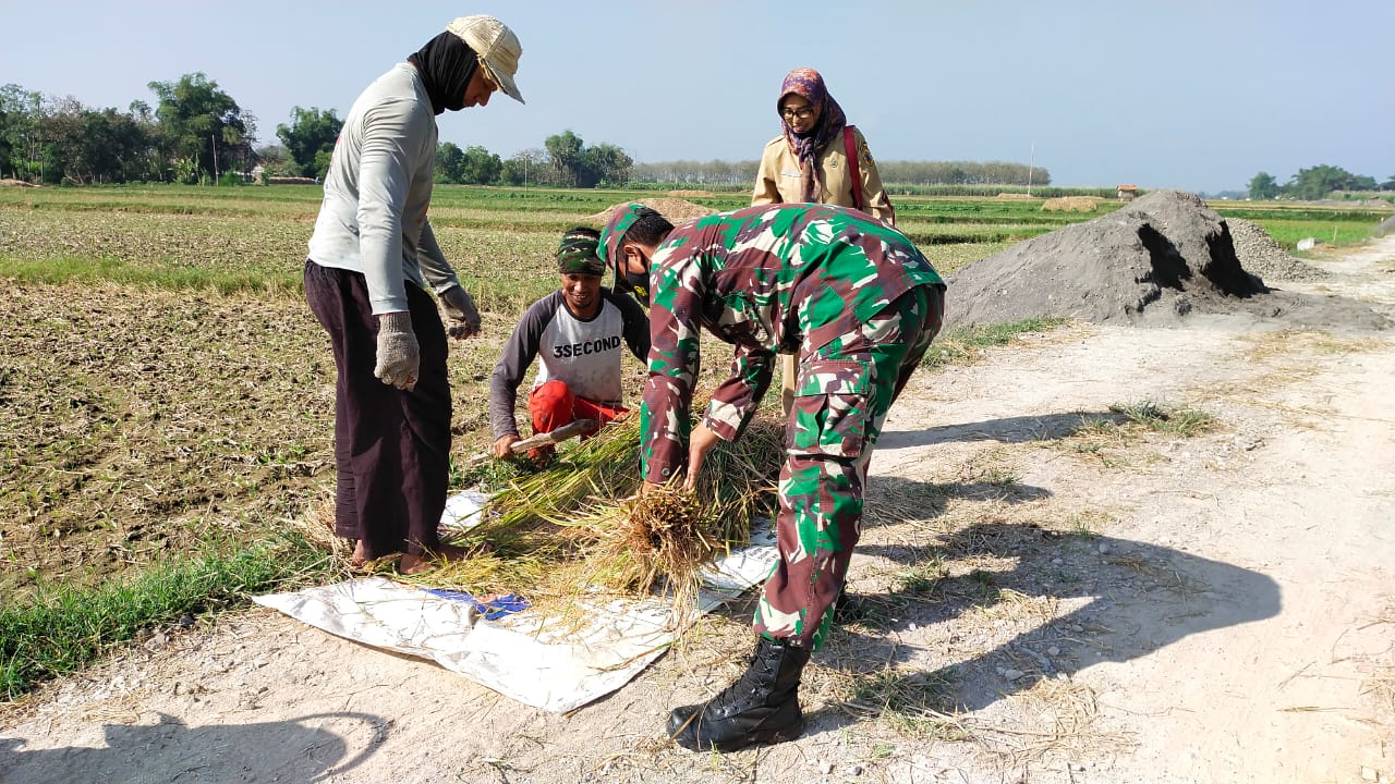 Pati- Disela kegiatan betonisasi yang sedang dilaksanakan di desa Tamansari, salah satu personel satgas Serda Subakir siang tadi turut membantu kegiatan ubinan padi di sawah milik Saroji warga RT.02/02 desa Tamansari Jaken. Selasa,(15/06/2021).
