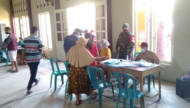 Seperti tidak ada rasa capeknya, Sertu Deden anggota Koramil 14/Gunungwungkal Kodim 0718/Pati selepas melaksanakan kegiatan TMMD, ia menyempatkan diri memantau kegiatan Vaksinasi di desa Tamansari.