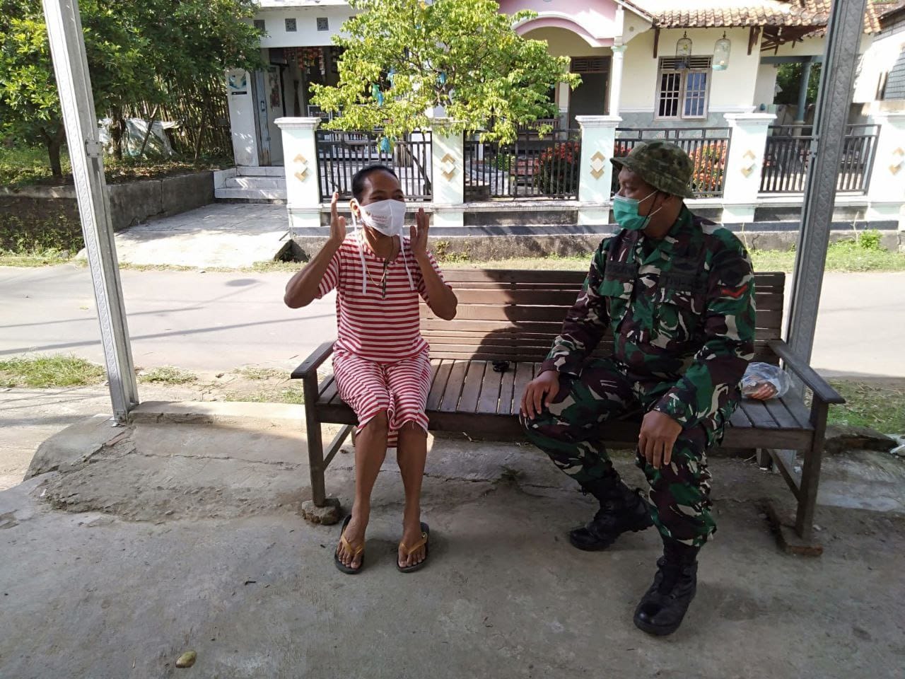 menindaklanjuti surat telegram dari Komando atas untuk pencegahan dan meminimalisir penyebaran virus corona dilokasi TMMD Reguler Ke 111 Tamansari, salah satu anggota satgas TMMD Membagikan Masker dan mengedukasi kepada masyarakat untuk selalu memakai masker menjaga jarak dan menghindari kerumunan untuk mencegah penyebaran virus corona 19, Selasa 13/07/21, ucap Kopda Suryono.