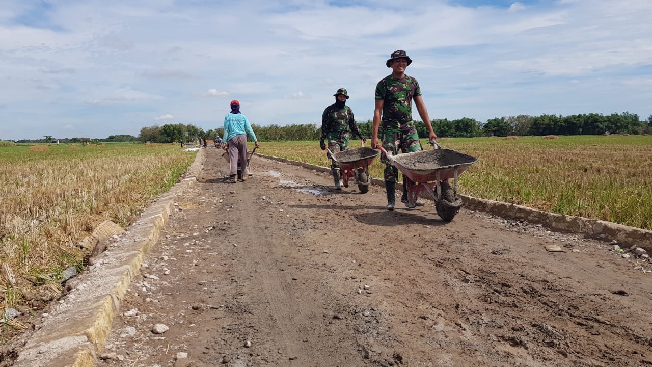 Pati – TNI Manunggal Membangun Desa (TMMD) reguler ke 111 Kodim 0718/Pati dalam pekerjaan pembangunan jalan betonisasi yang menghubungkan Desa Tamansari menuju Desa Sumberarum saat ini terus dikebut pengerjaannya. Terlihat anggota satgas TMMD sibuk dalam melangsir matrial berisi adonan cor beton yang menuju tempat akan digelarnya cor, Jum’at (25/06/2021).