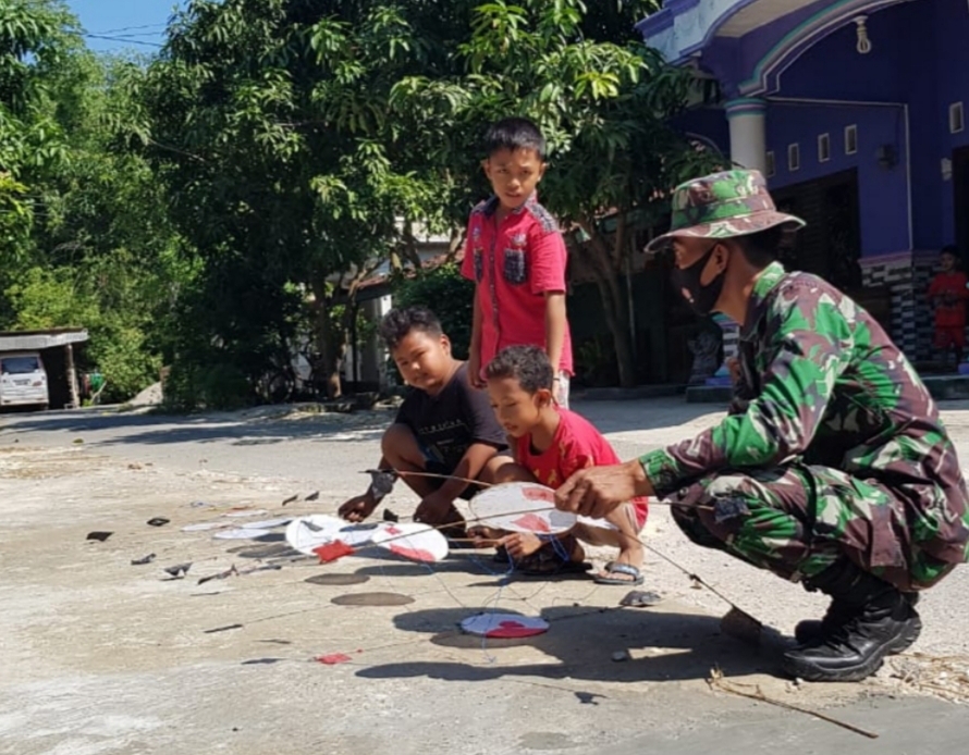 Seperti terlihat kali ini, Serda Sukarji anggota Satgas TMMD sedang menghampiri anak-anak yang sedang membuat layang-layang di depan rumah warga. Berbekal pengalaman waktu kecil, Serda Sukarji membantu anak-anak membuat kerangka layang-layang,